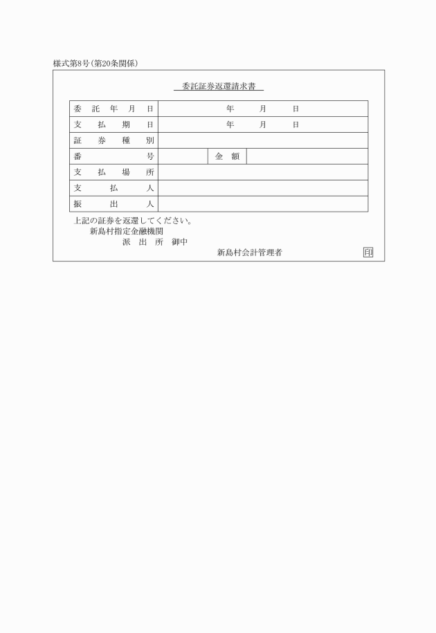 第20条 出納取扱店は、委託を受けた有価証券が不渡りとなったとき、又は派出所において委託証券返還請求書により会計管理者から有価証券の返還請求を受けたときは、当該有価証券及び納付書等に委託証券返還添票を添付して派出所を通じ、会計管理者に送付し、返還証券受領書を受けなければならない。