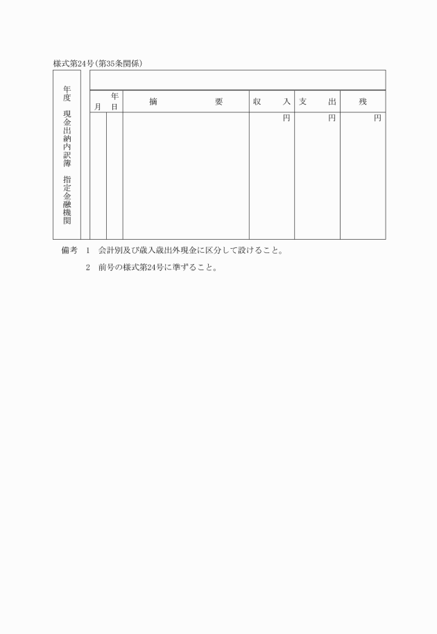 第35条 出納取扱店は、公金の取扱いについて、次に掲げる帳簿を備え、公金の出納並びに有価証券の取立て及び納付又は納入の受託を整理しなければならない。ただし、必要があるときは、補助簿を設けることができる。