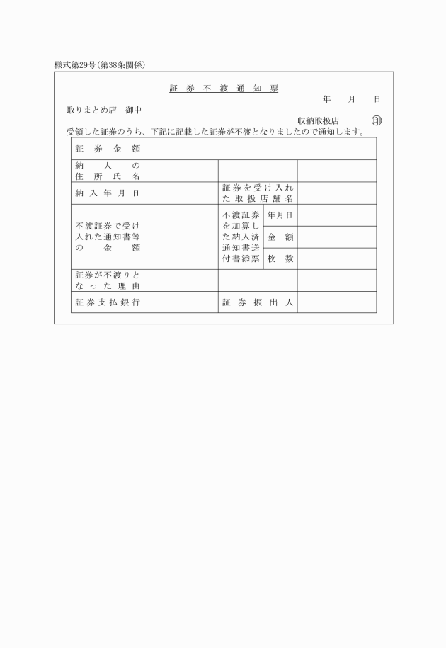 第38条 収納取扱店は、収納金として受領した証券が不渡りとなったときは、証券不渡通知票により取りまとめ店に報告するとともに、速やかに納入者に対し書面によってその旨を通知し、証券を納入者に返付するとともに、先に交付した領収書の返還を受けなければならない。この場合において、拒絶金額を控除した額の領収書を納入者に新たに交付しなければならない。