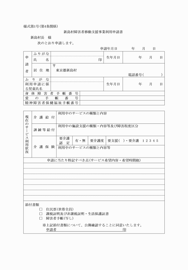 第5条 新島村長は、前条の規定に基づく申請があったときは、申請者の希望する移動支援の内容、時間等を審査し移動支援の利用の要否を決定する。