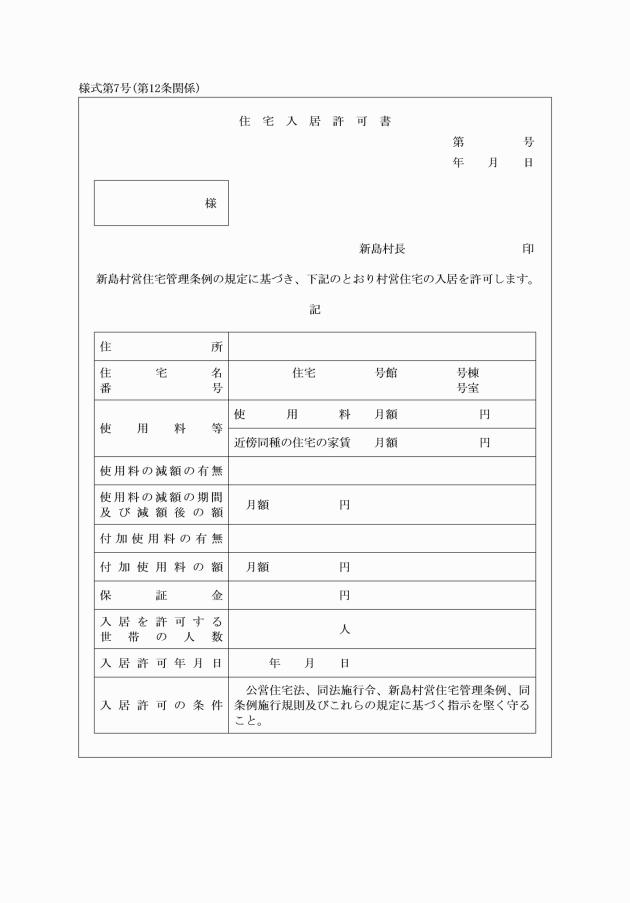 第3条 村営住宅に入居しようとする者(以下「申込者」という。)は、村営住宅入居申込書(様式第1号)を村長に提出しなければならない。