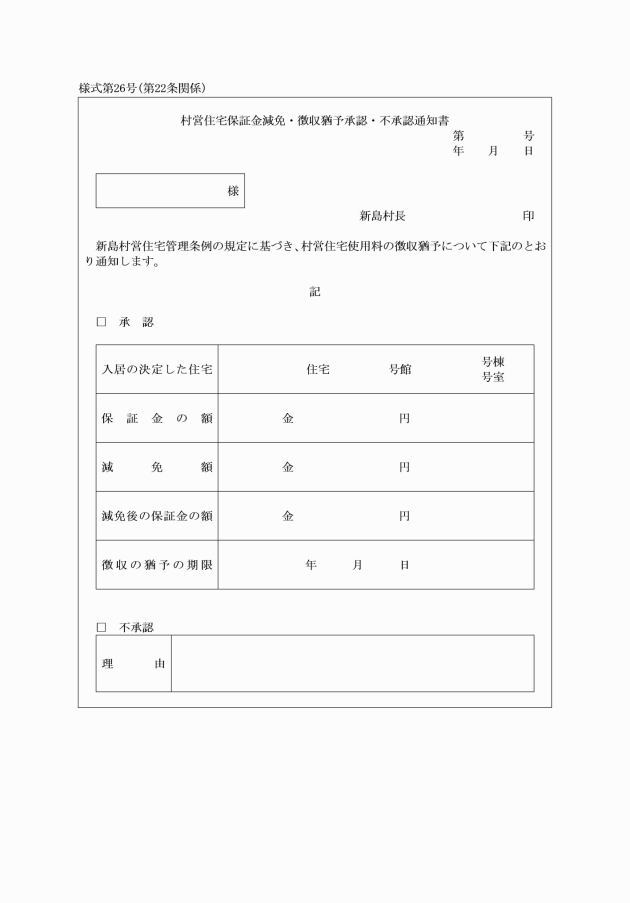 第27条 条例第27条第1項ただし書の規定により村長の承認を得ようとする者は、住宅模様替・増築・住宅敷地内工作物設置承認申請書(様式第30号)を村長に提出しなければならない。
