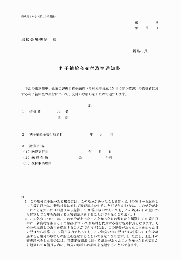 第7条 利子補給金の交付決定を受けた借受者が、利子補給金の交付を辞退するときは、辞退届(様式第5号)を作成し、速やかに都に提出し、都はその写しを村に送付する。