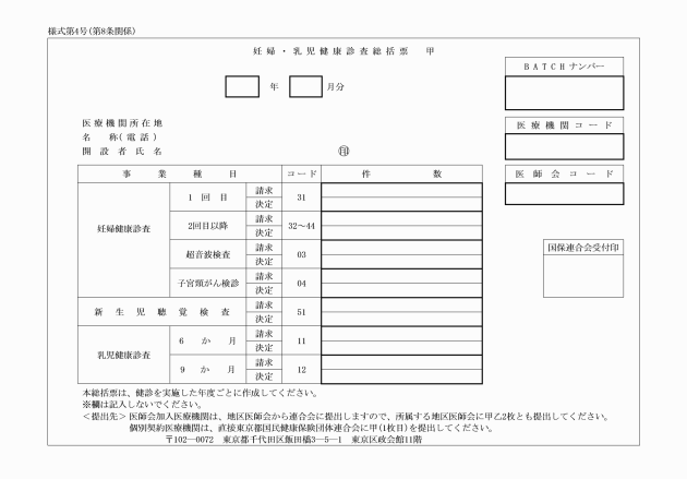 第8条 医師会加入医療機関は、当月分の請求原票に妊婦・乳児健康診査総括票(様式第4号。以下「総括票」という。)を添えて、所属する地区医師会に提出する。
