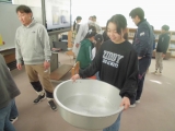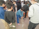 1月19日は食育朝会がありました。1月24日からはじまる全国学校給食週間についてのお話と、給食室についてのお話を栄養士の先生からしていただきました。普段なかなか見ることのできない、給食室の中の様子を教えていただきました。そして、釜とたらいと油の入った一斗缶を触ったり、持ったりし、大きさと重さの体験をしました。これからも 、食べ物、生産者さんたち、調理員さんたちへの感謝の気持ちを忘れずにおいしくいただきましょう。