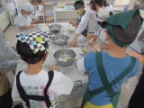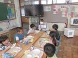 給食の時間に、実際にくずもちになっているのを見て、「うれしい。」と言っていました。栄養士の先生に、作っている様子を見せていただきました。食べてみると「おいしい。」と言いとても満足そうでした。