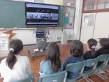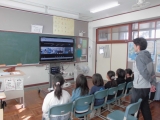 3・4年生がオンライン交流をしました。今日は式根島小と三鷹市の小学校と御蔵島小学校の3校でつなぎました。それぞれの学校が、学校やその地域のことを紹介しました。式根島小学校の3・4年生は、児童数や行事について、クイズ形式で紹介しました。これまで都内の学校や他の島の学校との交流がほとんどなかったので、子供たちは緊張する様子も見られましたが、相手校のクイズや発表を楽しんでいました。